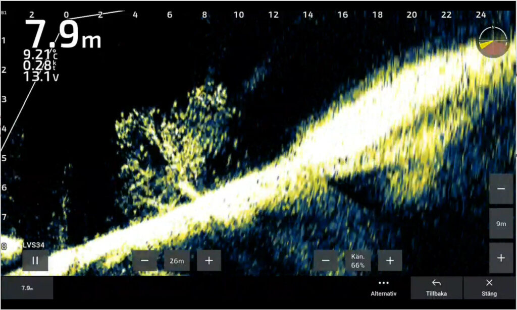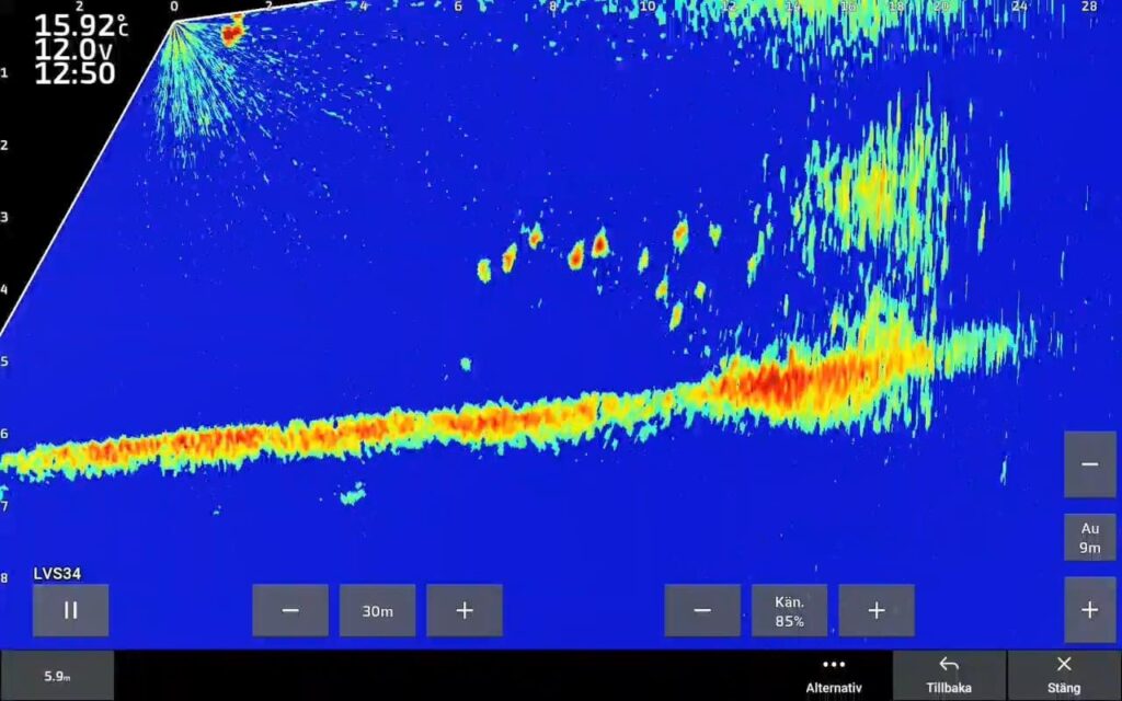 Att förstå hur man ställer in ekolodet för att få bra bilder är ju en viktig del av kursen och det får man ägna flera timmar åt. Downscan som här på bilden är det som är mest undervärderat i hela ekolodet men tittar man på bilden kan man se hur mycket information man får om man bara använder det.
