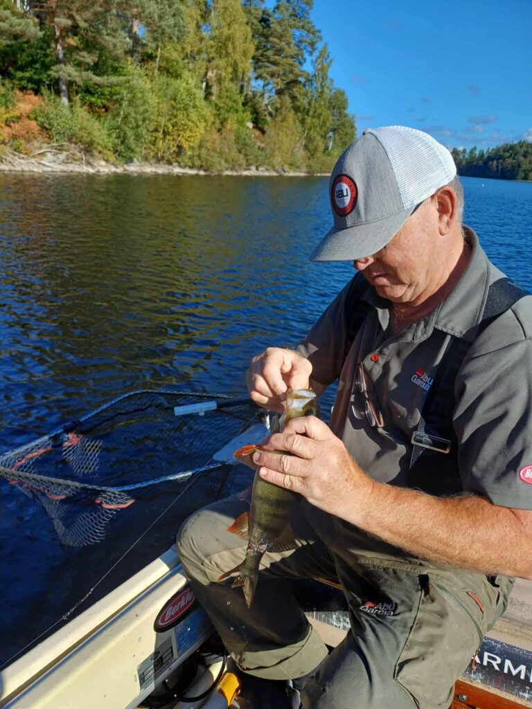 Bara några minuter efter att vi släppt i första mörten i vattnet är det en stor abborre framme och tittar på den. Det går ytterligare en minut innan den bestämmer sig och så sjunker flötet. En första ca 8 hg abborre hamnar i håven och vi är glada som klarat att lura den . På med en ny mört och en stund senare är nästa abborre framme och drar ner flötet. Samma storlek på den fisken som hamnar i håven med sin kompis.