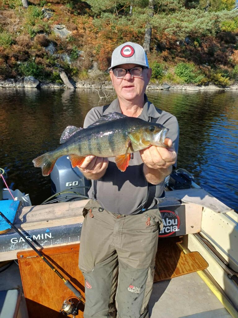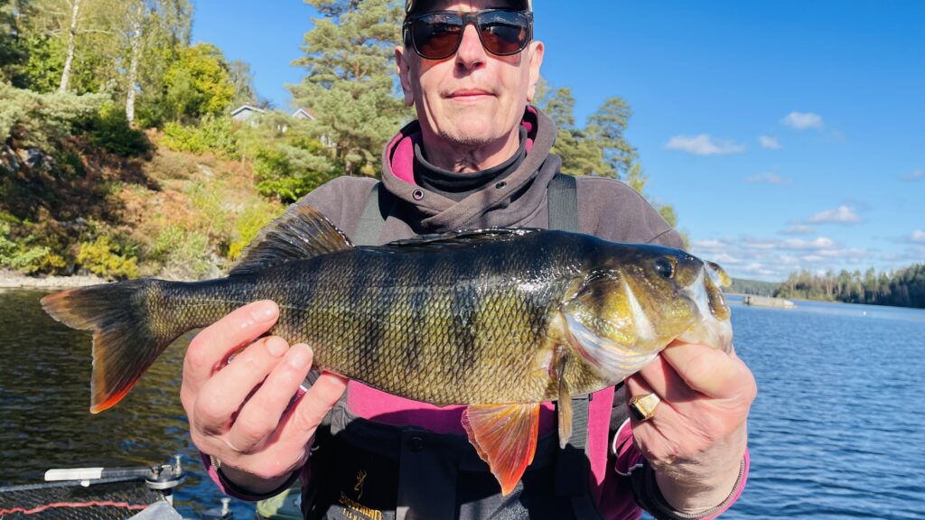 Per Erik som är den som ska meta tar sedan 4 fina abborrar i rak följd där två är rejält över kilot. Den största är ca 1,35 kg och blir dagens största. Den har vi tyvärr ingen bild på då P E lyckades att göra ett stilfullt ”tyska hoppet i pik” med den när han skulle ta den ur håven. Sånt händer, men den är kvar i sjön som all andra vi fick. Så vi kan hälsa på dem en annan dag i framtiden. Några ytterligare abborrar tar men men det blir allt segare. Vädret är bra men abborrarna tvekar men trotts detta lyckas vi få en tredje över kilot som faller för mörten.