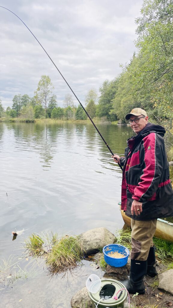 När vi kommer ut på sjön där vi ska meta med mörtarna provar vi först som vanligt med olika jiggar och tackel för att föröka lura några stora abborrar. Men vad vi än erbjuder dem är de helt omöjliga att få dem att bita. Vi ger det 3 timmar utan att vi får annnat än gäddor, för de kommer man aldrig undan . När vi provat intill 4 olika risvasar utan att lyckas få en enda abborre att öppna munnen ger jag upp. Nu riggar vi ett spö för att meta med levande mört istället.