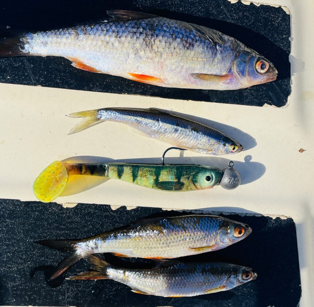 Jag lade upp några som senare dog på ett litet bord som visade storleken på både löja och mört. Jiggen är 9 cm, lika lång som en finger.
